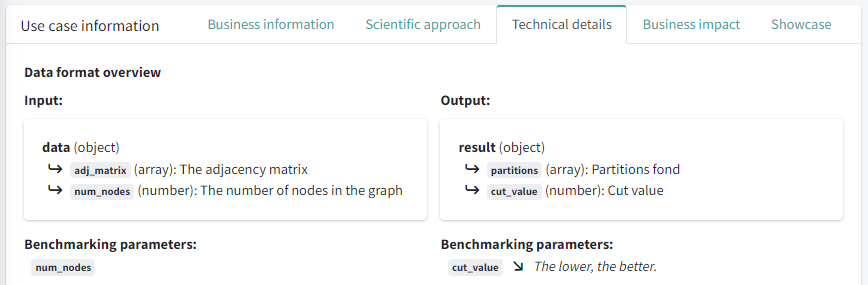 Here’s an example of the Max Cut use case input and output specification in JSON format: